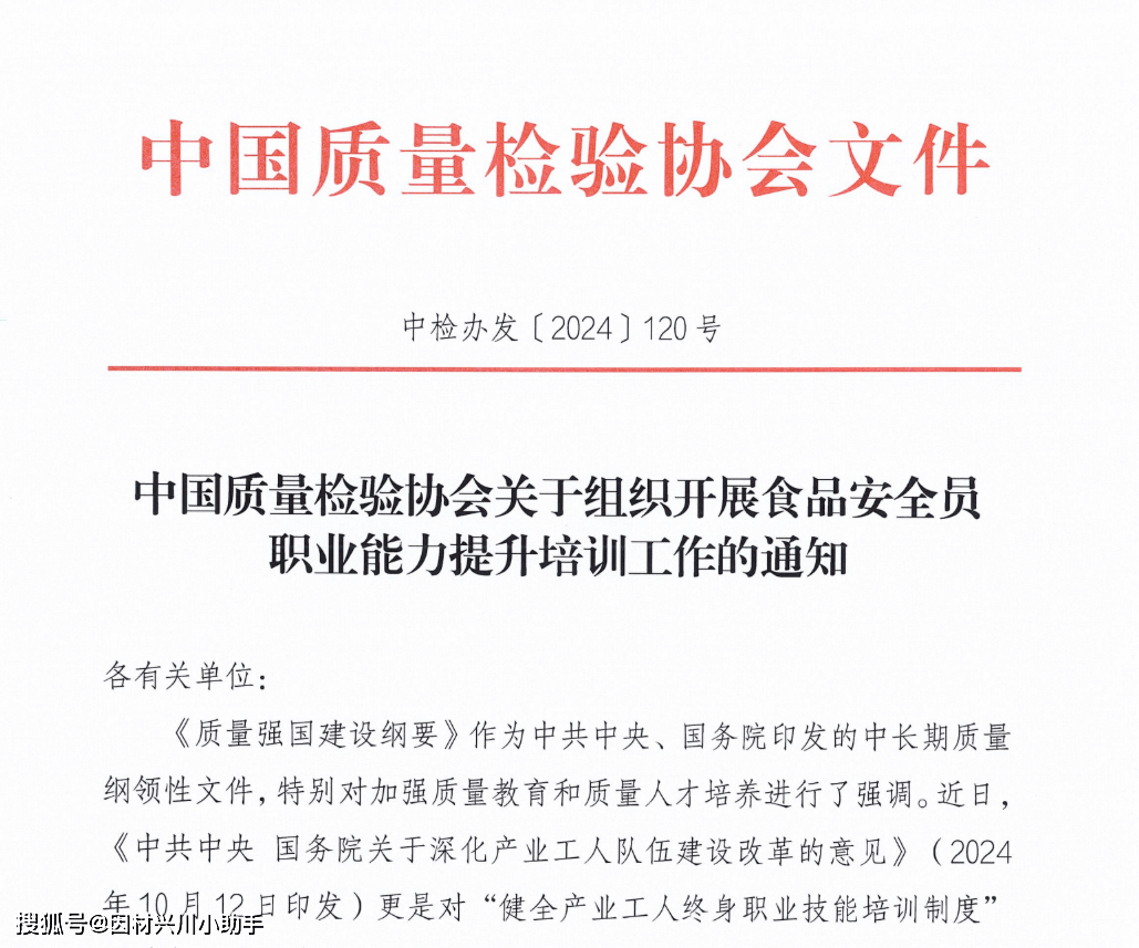 食物平安员职业前景广漠且积极。跟着社会对健康日益注沉及监管系统持续完美,食物行业对专业人才的需求持续扩大。该职业不只就业不变,笼盖出产、餐饮、畅通等浩繁范畴,更具备清晰的晋升径,可向质量办理担任人等办理层成长。专业能力凸起的食物平安员价值凸显,职业成长不变而。《关于深化财产工人步队扶植的看法》(2024年10月12日印发)更是对“健全财产工人终身职业技术培训轨制”“落实企业培育财产工人的义务”“阐扬行业协会、社会培训机构感化,帮帮中小企业开展技术培训”等做出了明白摆设。按照《食物平安法》、《劳动法》等法令律例的,按关决策摆设和《企业落实食物平安从体义务监视办理》(市场监管总局令第60号)等从管部分的政策要求,为了深切贯彻落实新时代人才强国计谋,督促泛博企业和查验检测机构提拔承担质量平安从体义务的能力,引领食物平安员精确把握其职责和权限并持续提拔岗亭履责能力,持续深切贯彻落实食物平安工做“四个最严”的要求,出力阐扬质量查验行业组织正在“党委带领、从导、政策支撑、企业从体、社会参取”高技强人才工做系统中不成或缺的积极感化,合力推进质量社会共治,帮力提拔食物平安员专业素养能力和程度,指导企业加强质量工做,推进企业产物和办事质量提拔,充实阐扬食物平安员正在产质量量提拔中的主要感化,办事高质量成长,推进质量强国扶植,中国质量查验协会组织开展食物平安员职业能力提拔培训工做。